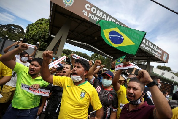 Los manifestantes en Brasilia cantaron consignas contra la corte suprema del país, que ha confirmado los confinamientos establecidos por estados, y contra el Congreso, cuyos legisladores de la oposición también han defendido las cuarentenas.