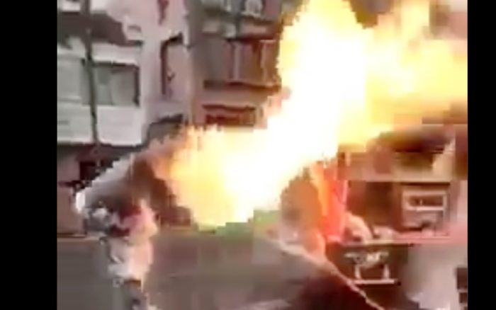En las imágenes que se viralizaron en redes se observa cómo carga en su hombro el tanque de gas que está en llamas, y después, cuando lo coloca en el piso, sus compañeros lo auxilian para extinguir el fuego con un extintor.