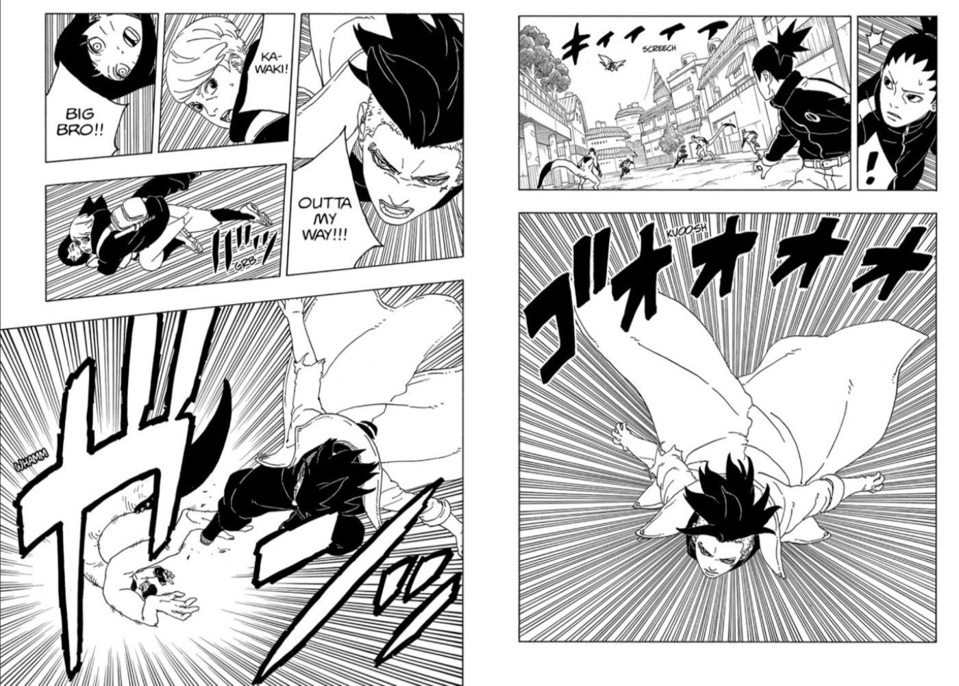 Mientras que todos los demás parecen involucrados en cosas más importantes, Kawaki parece un personaje secundario. Defiende Konoha porque está siendo atacada, pero no tiene la autoridad, el carisma ni el compromiso que uno esperaría. Parece que su único objetivo era deshacerse de Boruto, y una vez que lo logró, no le queda nada más como personaje. Esto se confirma principalmente por el hecho de que Kawaki no muestra ningún crecimiento en este capítulo, en términos de personalidad y poder. Se apresura a gritar “¡fuera de mi camino!” a sus aliados, es sorprendido por un Claw Grime y Shikadai tiene que salvarlo. Este es un marcado contraste con Boruto, quien apareció en la secuela con una actitud totalmente nueva y (parece) nuevos poderes impresionantes.