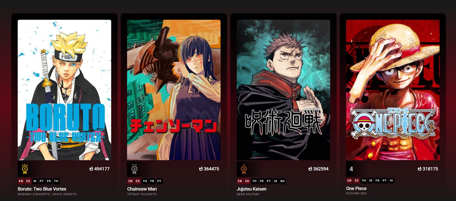 “/> MANGA Plus es una plataforma en línea donde se tradujeron versiones de manga de la línea de Shueisha. Saltar antologías de manga, incluidas Salto Shōnen, están publicados. El sitio también incluye el ranking de los títulos de manga publicados en la plataforma. En el momento de escribir, Boruto: dos vórtices azules está constantemente en la cima, distanciándose narutoEl viejo rival Una pieza por más de 200.000 visitas. Vale la pena señalar, sin embargo, que ambos Una pieza y Jujutsu Kaisen estuvieron en pausa en la semana que Boruto los superó.