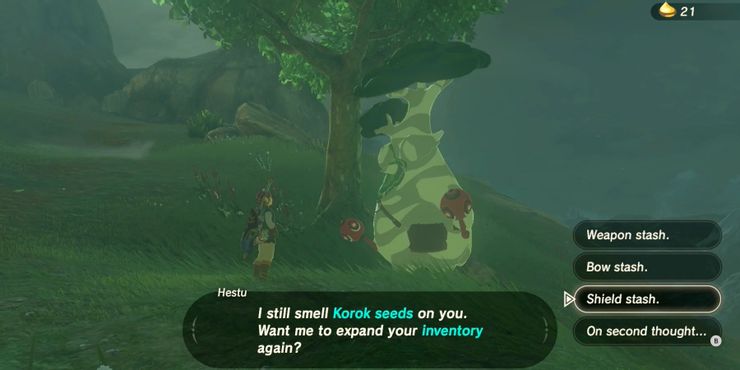 Antes de que los jugadores puedan darle Korok Seeds a Hestu, deben encontrar sus maracas. Esta misión secundaria se puede iniciar hablando con el gran Korok al sur de Kakariko Village. Los jugadores encontrarán los instrumentos en un cofre del tesoro ubicado en un campamento cercano de Bokoblin. Una vez devuelto, Hestu usará su magia para expandir el inventario de Link, a cambio de Korok Seeds. Junto con la mejora de Stamina y Heart Containers en Aliento de lo salvajeaumentar la cantidad de equipo transportado puede ser igual de importante.