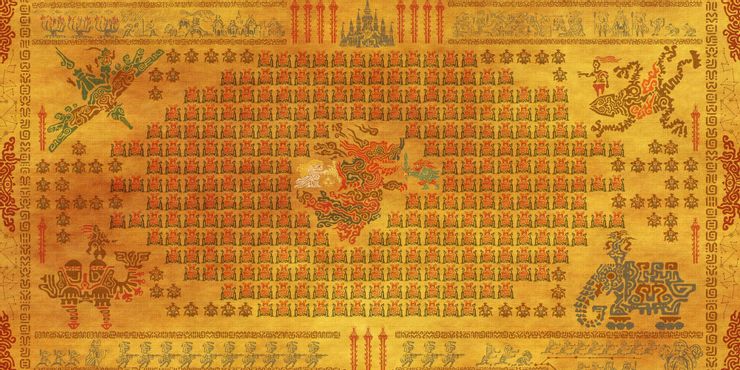 Cuando Link se despierta en el Santuario de la Resurrección a principios de Aliento de lo salvaje, no recuerda no solo los últimos 100 años mientras estuvo en hibernación, sino también la historia más amplia de Hyrule. La historia relatada por el fantasma del rey Rhoam Bosphoramus Hyrule en lo alto del Templo del Tiempo informa en gran medida a Link de lo que sucedió hace un siglo, pero no es hasta que se habla con Impa en Kakariko Village que se aprende el contexto histórico completo del juego. Un tapiz que cuelga en la casa de Impa (en la foto de arriba) representa el antiguo primer encuentro con Calamity Ganon y la defensa monumental requerida para sellarlo hace 10,000 años. Los cuatro de OTWLas Bestias Divinas fueron la punta de lanza de un ejército mecánico de Guardianes diseñado para apoyar a una princesa imbuida de poder sagrado y un caballero empuñando la espada que sella la oscuridad.