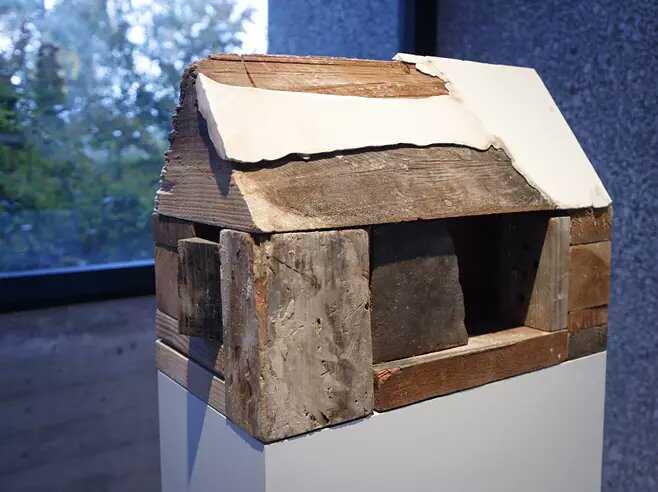Entre las nueve obras de Pitt que se exhiben hay una estructura en forma de casa moldeada en silicona transparente y con marcas de disparos, y su primera escultura, de 2017, “House A Go Go”: una casa en miniatura de 45 centímetros hecha de corteza de árbol, toscamente unida con cinta adhesiva.