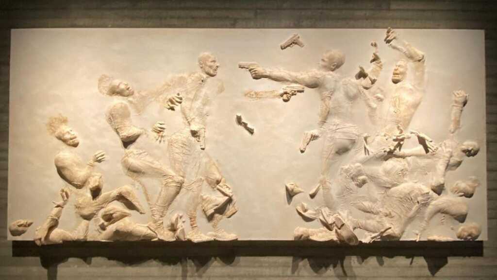 Las piezas más grandes incluyen una caja de bronce del tamaño de un ataúd que muestra manos, pies y rostros que intentan atravesar la estructura en varios ángulos, y una escultura de yeso que cuelga de la pared bautizada como “Aiming At You I Saw Me But It Was Too Late This Time” (Apuntando a ti, me vi, pero esta vez era demasiado tarde”, de 2020, que representa un tiroteo entre ocho figuras.