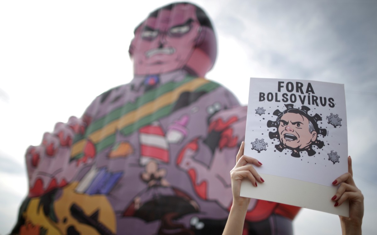 En Sao Paulo, la ciudad más grande de Brasil, miles de personas con mascarillas bloquearon una de las avenidas más grandes de la ciudad, donde un gran globo representaba a Bolsonaro como un vampiro.