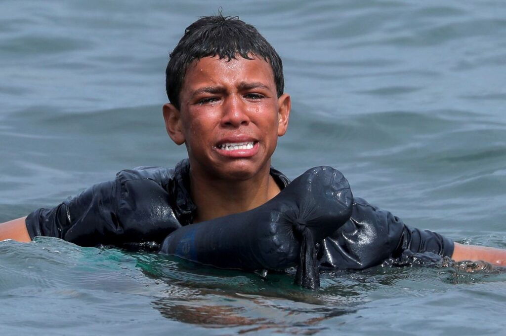 Pero de entre todas las imágenes, una de las que se ha quedado pegada en mi memoria es la de Jon Nazca que muestra a un niño en el agua con unas cuantas botellas de plástico bajo la camiseta amarradas en forma del chaleco salvavidas más precario que haya visto jamás. En la foto aparece llorando, probablemente esté exhausto. Forma parte de ese casi millar de niños no acompañados que ahora duermen en los centros de Ceuta en las estanterías de los almacenes o apiñados en un patio descubierto en el que tal vez se oyen las chicharras o el chapoteo del agua que tuvieron que remar. Quizá sea uno de aquellos niños que se fueron de casa sin siquiera avisar a sus padres y ahora deambula por las calles ceutíes como si fuera el país de Nunca Jamás de los sueños rotos mientras ellos van en su busca hasta la valla.