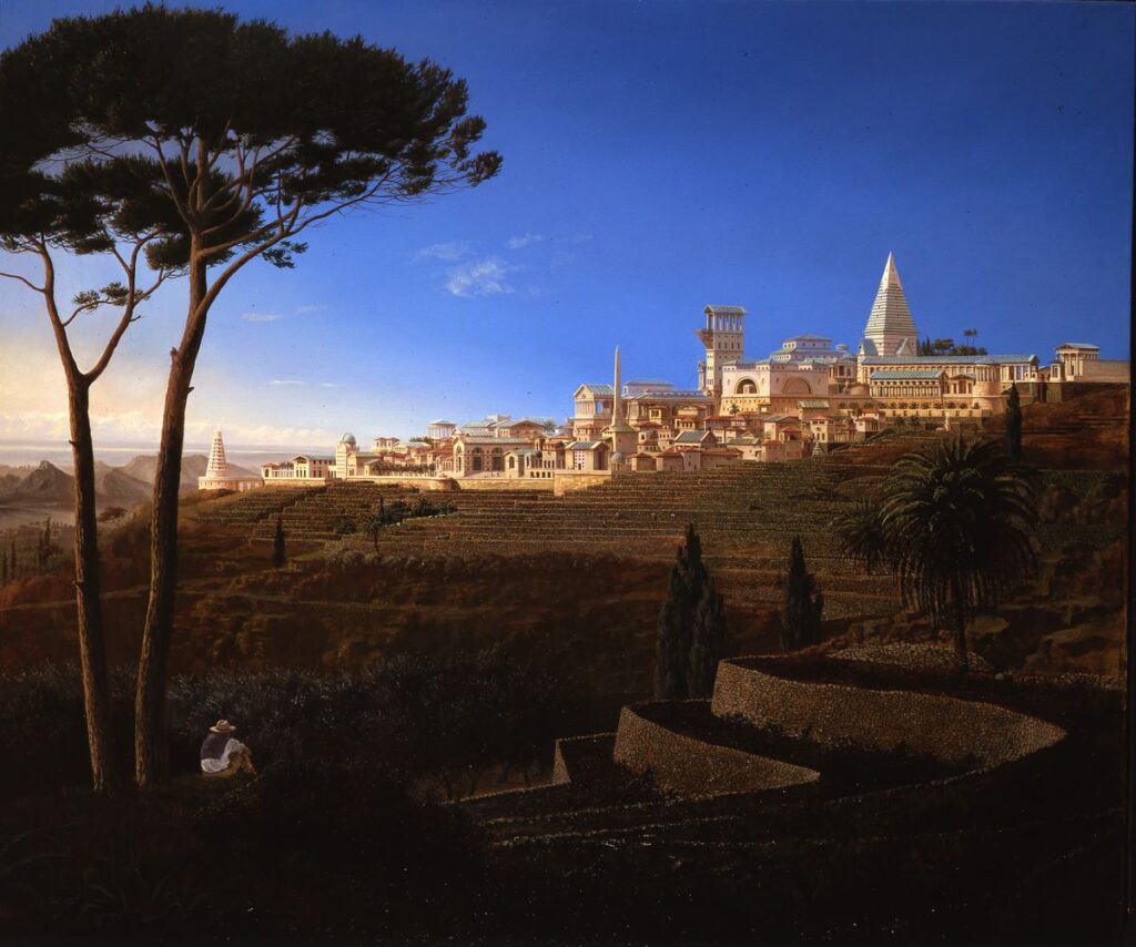 Sinuosos muretes de piedra volcánica negra redibujan la topografía abrupta de un cerro, sobre el que refulge una ciudadela blanca como el marfil. Un collage de arcos, columnas, pirámides, obeliscos y cúpulas componen lo que parece el decorado de una superproducción de la Era Dorada de Hollywood, una recreación de la Grecia Antigua que se recorta sobre un cielo azul oceánico. Un pastor aparece sentado junto a un árbol y, como Adán recién expulsado del Paraíso, mira hacia esa Arcadia onírica mientras sueña con ser un erudito con traje de lino beis como los que moran en su interior.