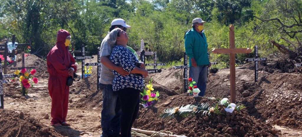 En los sitios de entierro se trabajan horas extras para satisfacer la demanda de nuevas tumbas. En Santa Cruz, en el este de Bolivia, un campo de césped bordeado de palmeras, donde los familiares se congregaban después de los funerales, ha sido excavado para dar paso a una fosa común, en la que el personal de la brigada desliza cuerpo tras cuerpo.