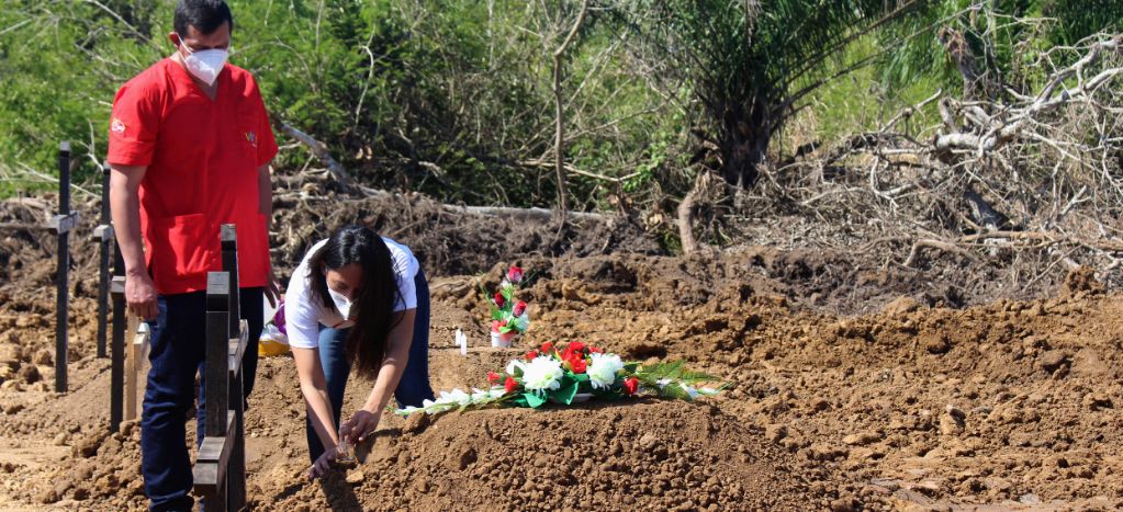 En los sitios de entierro se trabajan horas extras para satisfacer la demanda de nuevas tumbas. En Santa Cruz, en el este de Bolivia, un campo de césped bordeado de palmeras, donde los familiares se congregaban después de los funerales, ha sido excavado para dar paso a una fosa común, en la que el personal de la brigada desliza cuerpo tras cuerpo.