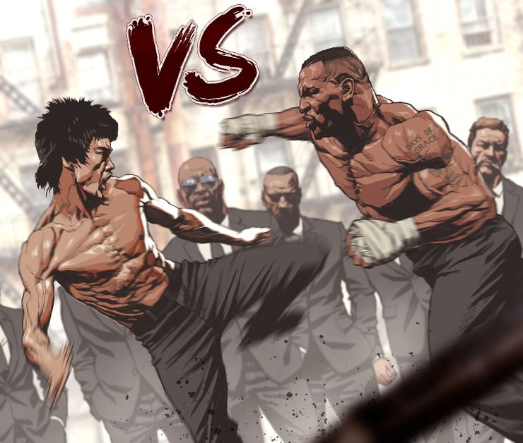 Fan Art al estilo de un cómic que enfrenta a la leyenda de las artes marciales Bruce Lee contra el icónico boxeador Mike Tyson en una pelea callejera a puño limpio.