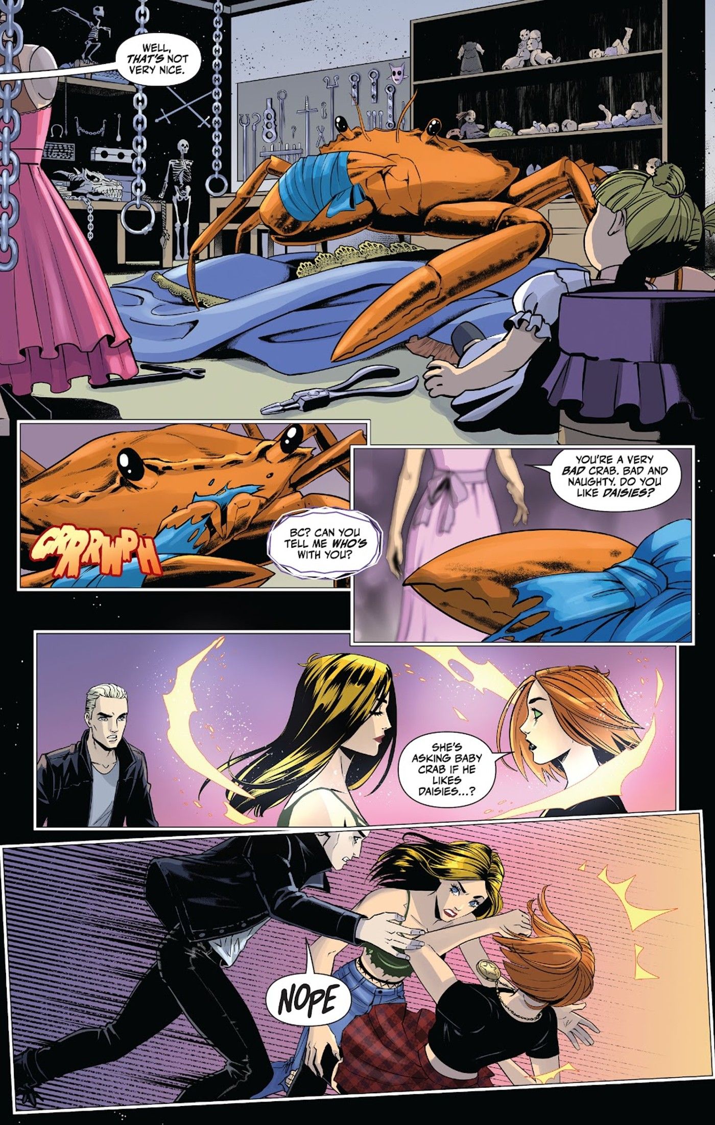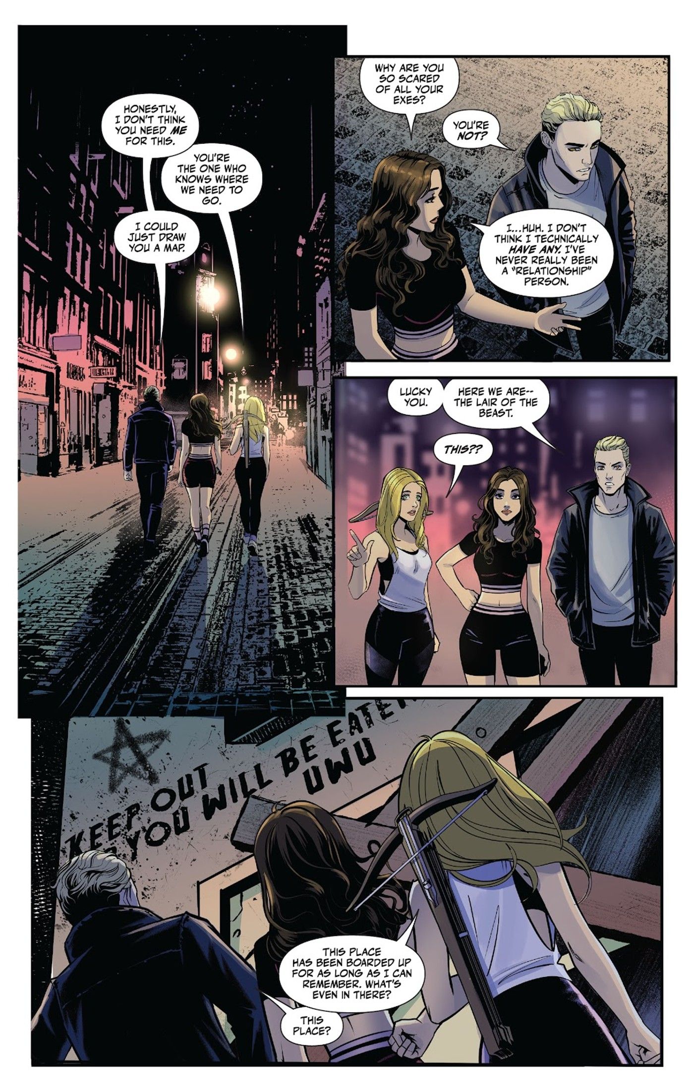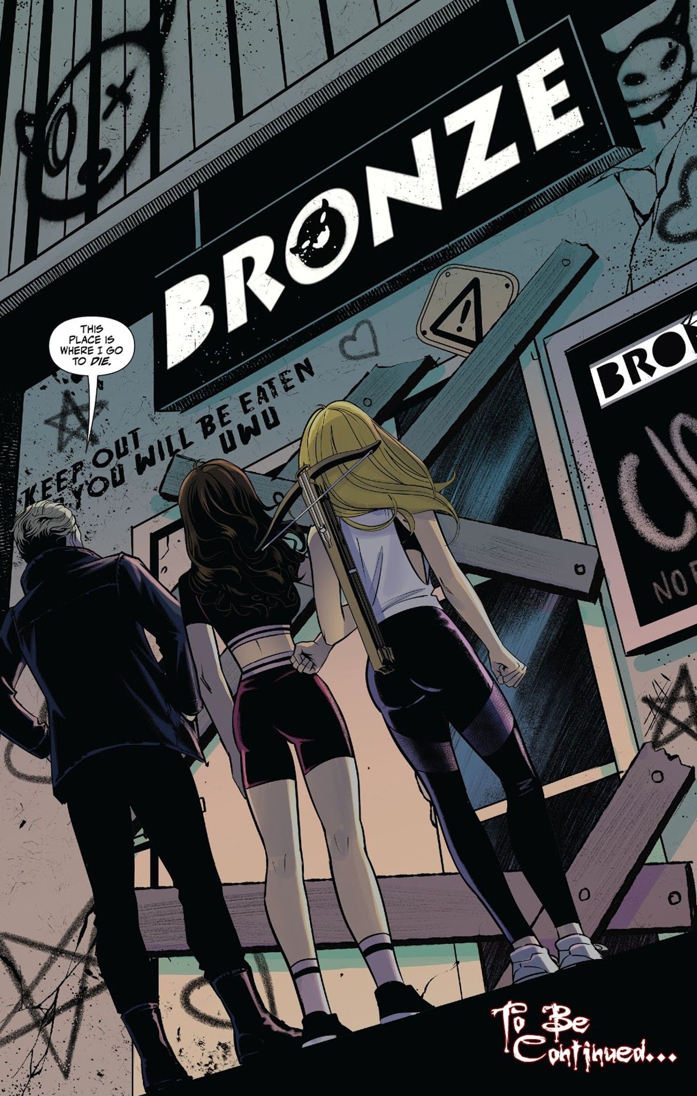 Cuando el dios cangrejo bebé en cuestión desaparece en Sarah Gailey y Kath Lobo’s El cazador de vampiros # 13, los Scoobies pueden rastrearlo hasta la guarida malvada de uno de los ex de Spike. Aún no se ha revelado o visto quién podría ser específicamente, pero se insinúa fuertemente que los fanáticos crean que el ex es Drusilla. Cuando Spike lleva a Buffy y Faith al paradero de su ex, van a un edificio abandonado que ha sido completamente destrozado con grafitis y otros daños. Hay dos letreros en el frente: una lectura de advertencia ominosa, “Mantente Fuera – Te Comerán, UwU,” y lo que parece ser el nombre del edificio original, The Bronze, un nombre con el que los fanáticos de toda la vida deberían estar muy familiarizados.