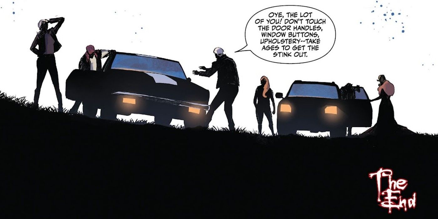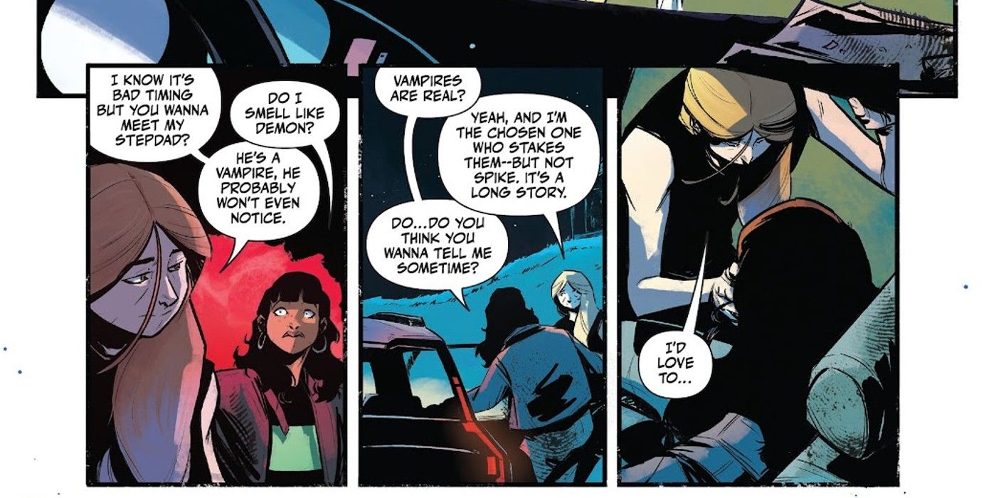 Al mismo tiempo, con Willow muerta y Tara en otro lugar, Buffy y Spike adoptan efectivamente a Thessaly. En La última cazavampiros #5, si no era evidente de inmediato que la vida de lucha de Spike había quedado atrás, queda claro cuando decide quedarse en el auto escuchando podcasts mientras Buffy y Thessaly forman un raro equipo para derrotar al último monstruo de la historia. semana. Una vez que todo está dicho y hecho, Thessaly le pregunta a su novia si quiere conocer a su padrastro, refiriéndose a Spike. Fácilmente podría haberlo llamado su Vigilante, o incluso entrenador, pero optó por el papel que más le resonaba.
