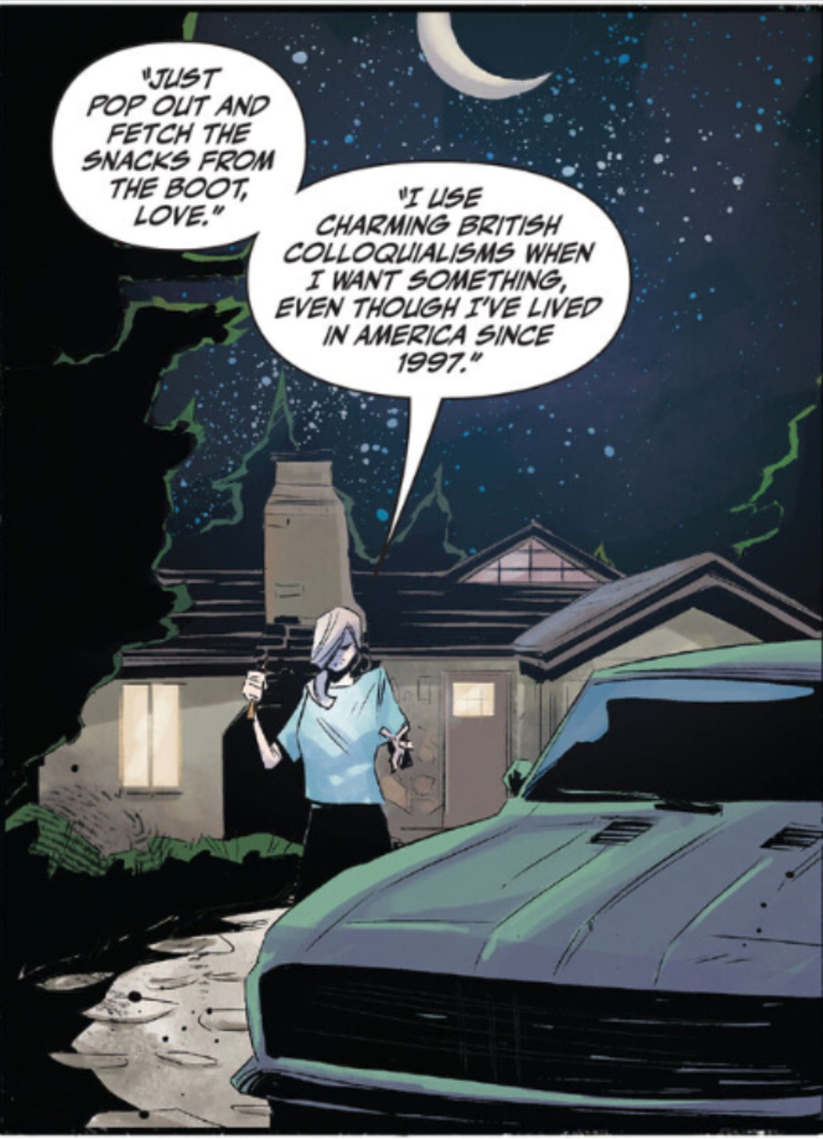 Buffy: La última cazavampiros # 1, escrito por Casey Gilly, con arte de Oriol Roig y letras de Ed Dukeshire, presenta varios momentos memorables entre los amantes, pero es un momento en el que Spike está ausente que se destaca más: Buffy gruñona burlándose de su acento. , lo que sugiere que debería haberse desvanecido ya que Spike tiene “vivido en Estados Unidos desde 1997“, lo que implica que el famoso vampiro vanidoso afecta su acento.