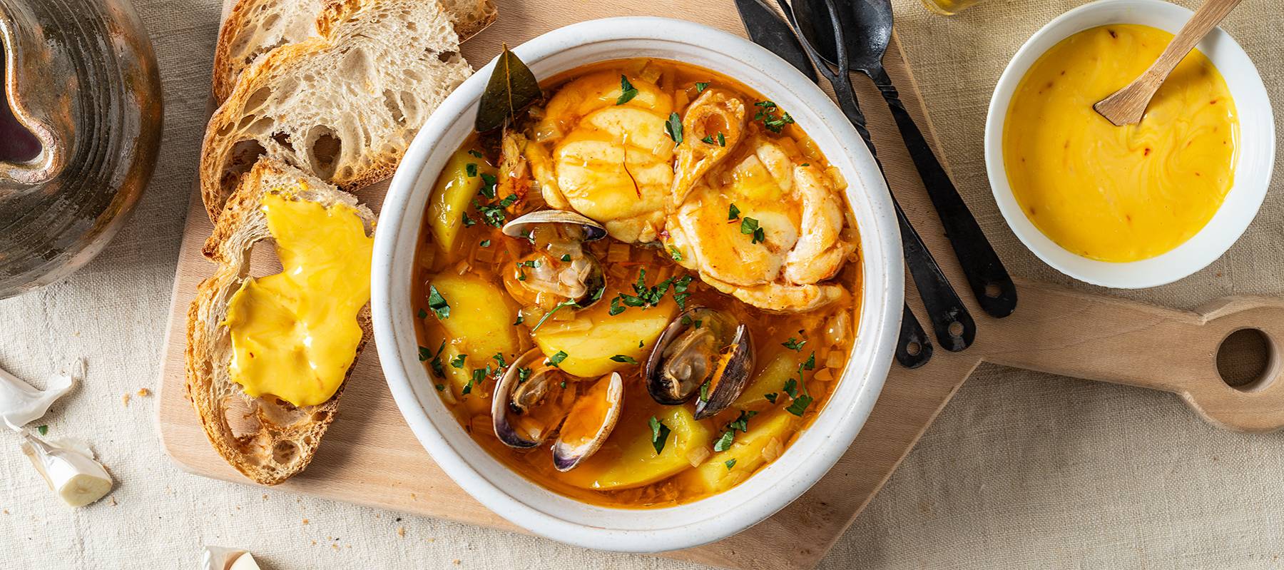 Para servir, frotar ajo en las rebanadas de pan tostado y mojar con un chorrito de aceite de oliva. Untar cada rebanada con salsa rouille. Sacar los pescados a una fuente y servir con el caldo de pescado y patatas en una cazuela, acompañado todo por el pan con rouille, y servir.