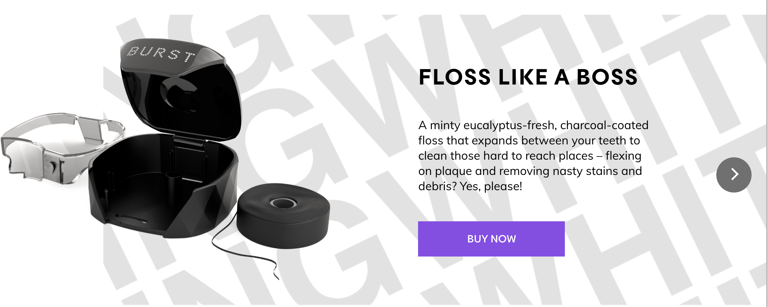 El nuevo producto es un hilo dental de $ 12.99 con sabor a menta, eucalipto y recubierto de carbón que se expande entre los dientes. El hilo dental de Burst viene en un estuche para bobinas de reemplazo, que se pueden entregar a la puerta de un cliente por $ 6.99 por mes.