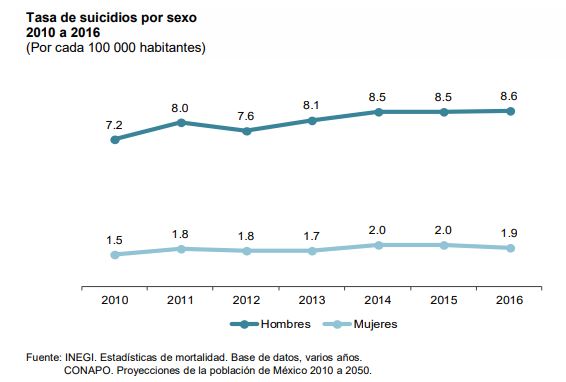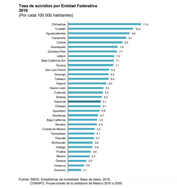 Hasta 2016, los estados que tuvieron mayores tasas de suicidio por cada 100 mil habitantes fueron Chihuahua, 11.4; Yucatán, 10.2; Aguascalientes, 9.6; Campeche, 9.1; y Colima, 8.5.