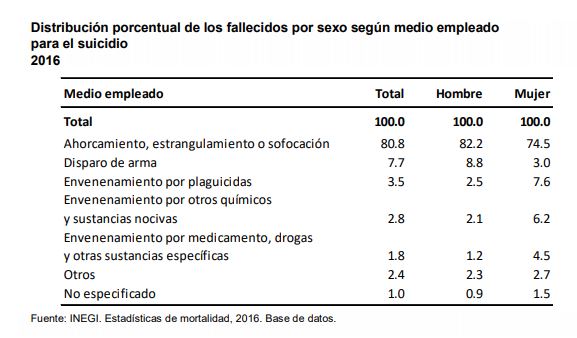 Y entre las estrategias para llevar a cabo el suicidio, el ahorcamiento, estrangulamiento o sofocación se sigue siendo la principal práctica para el suicidio, con 80.8% del total de suicidios para ese año, seguido del disparo con arma, 7.7%; y envenenamiento por plaguicidas 3.5%.