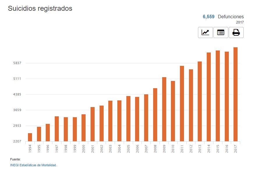 En nuestro país se registraron 6,559 suicidios en 2017, de acuerdo con datos del Instituto Nacional de Estadística y Geografía (INEGI).