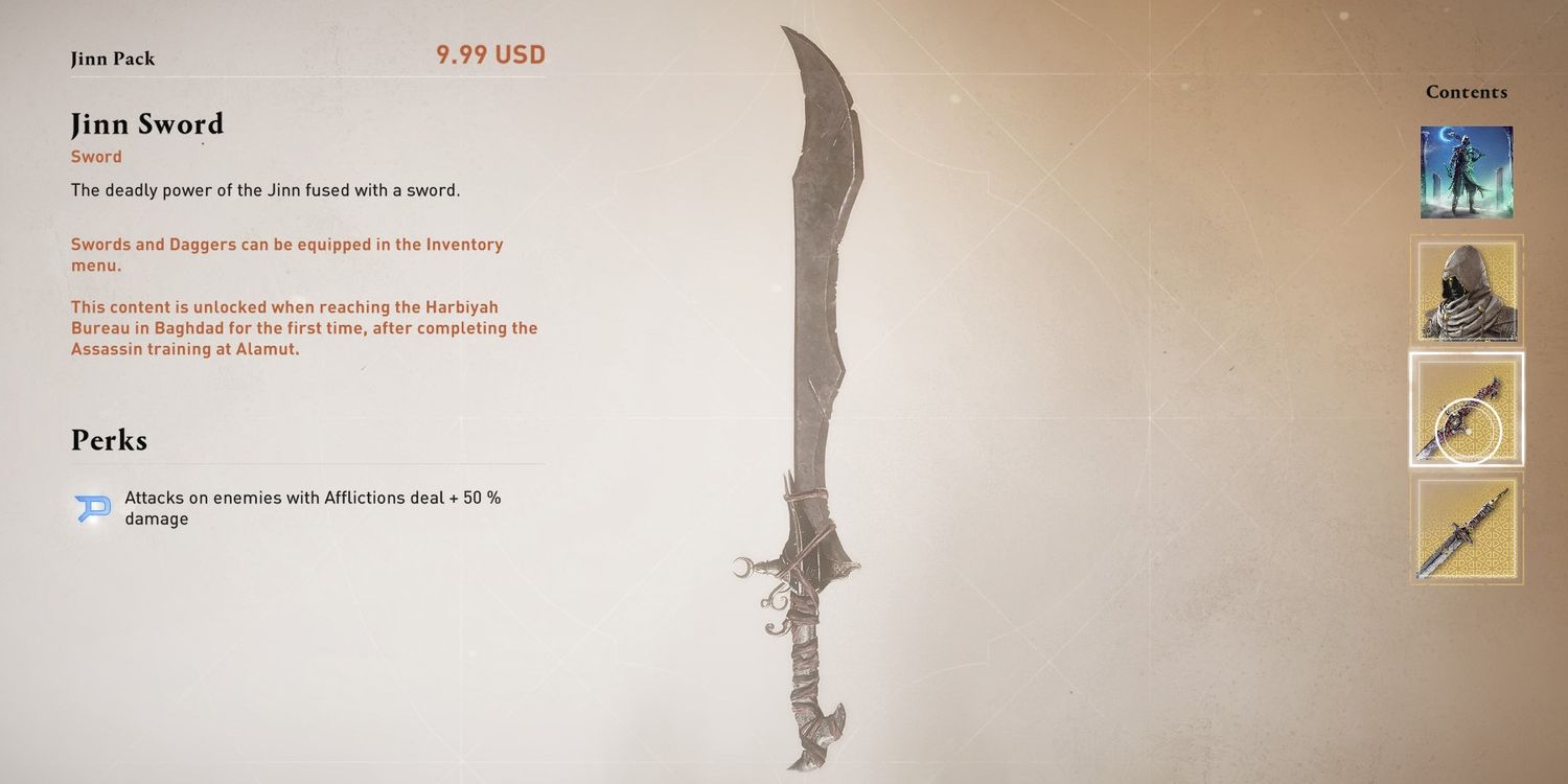 El aspecto rudo de la Jinn Sword es innegablemente genial, y el tamaño de la hoja le da un peso visual impresionante. Sin embargo, como una de las armas DLC del juego, puede ser difícil argumentar que su apariencia vale la pena. En última instancia, carece del dinamismo de Espejismo del Credo del AsesinoSon las mejores espadas, y es probable que Basim tenga opciones competitivas o superiores cuando pueda usarse en el juego.
