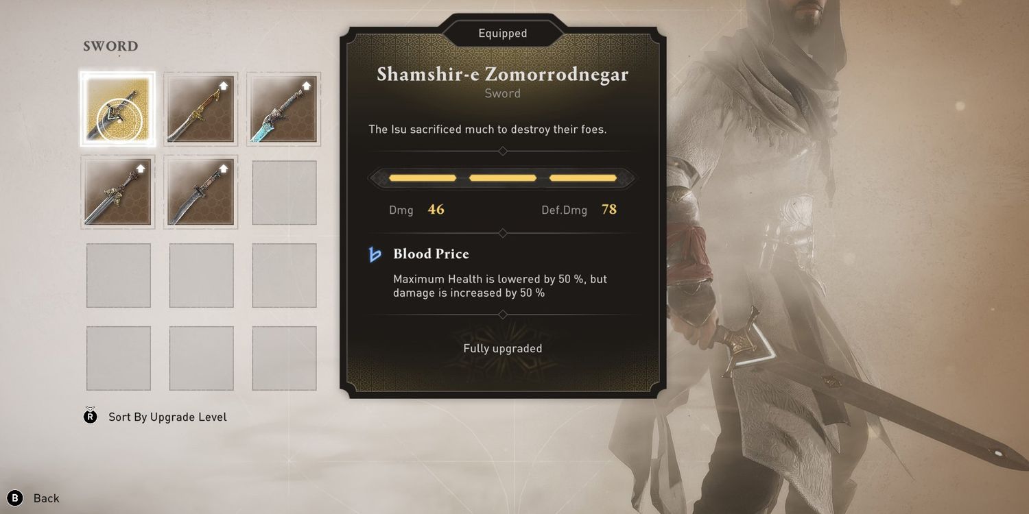 Procedente de una fuente inusual, la Shamshir-e Zomorrodnegar tiene una sensibilidad ligeramente anacrónica, con una cuña brillante en la parte inferior de la hoja que la distingue de otras espadas de Bagdad. La hoja en sí es bastante sencilla, aunque presenta un toque de ornamentación para romper la monotonía. Su utilidad es una de las más transformadoras, ya que reduce la salud de Basim y aumenta su daño, pero siempre es posible darle una apariencia diferente para aquellos que prefieren otra apariencia.