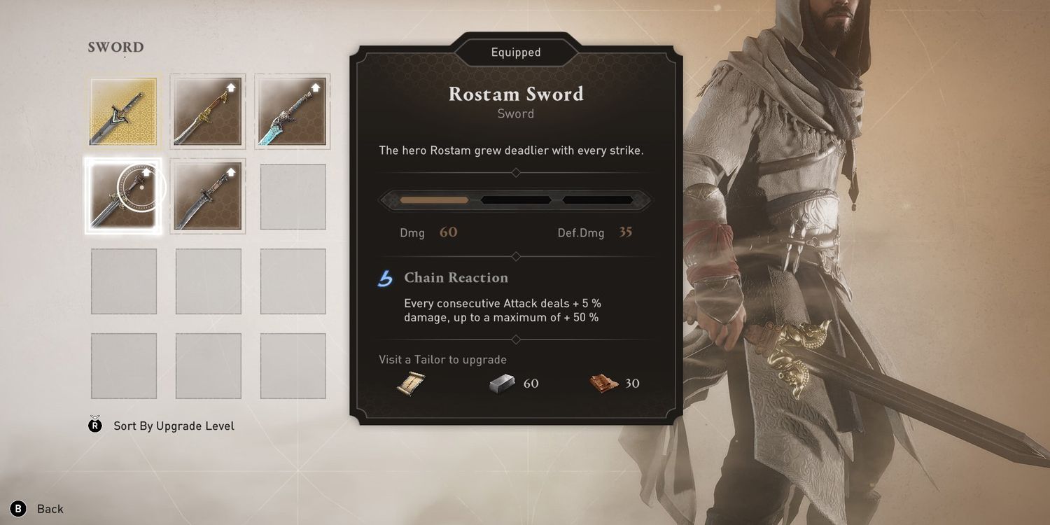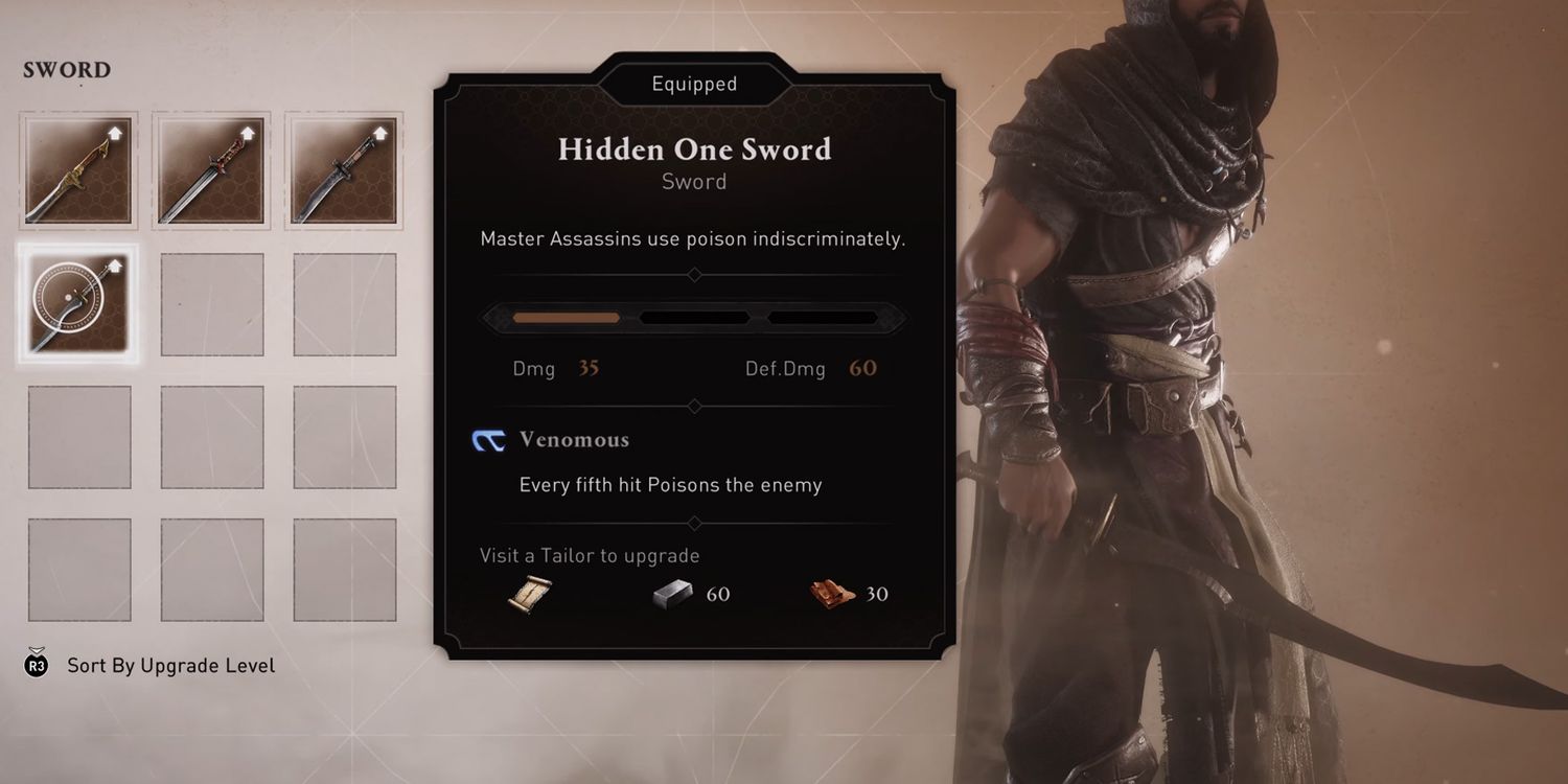 La Espada Rostam lleva el nombre de un héroe legendario del mito persa, y el arma hace un trabajo razonablemente bueno a la altura de ese legado. Una guarda cruzada muy estilizada sin duda agregaría algo de peso real a esta arma, potencialmente compensada por una longitud inusualmente profunda a lo largo de la hoja. La Espada Rostam tiene el mayor impacto visual de cualquier espada recta incluida en el juego base de Espejismo del Credo del Asesinoy la capacidad de adquirirlo bastante temprano en la narrativa hace que valga la pena probarlo.