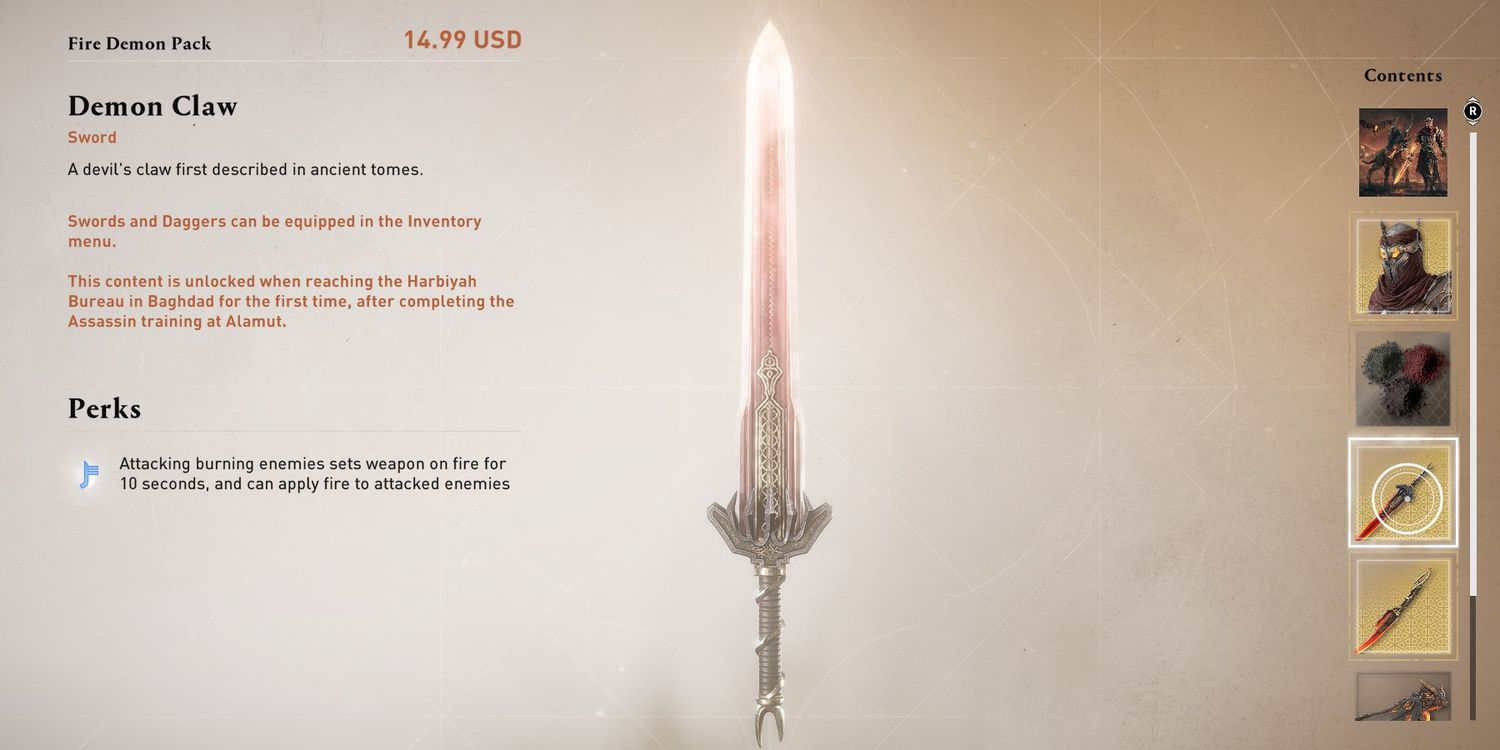 La Garra Demoníaca es posiblemente la más llamativa de Assassin’s Creed Mirage’s espadas rectas, gracias en gran parte a la hoja al rojo vivo que puede prender fuego a los enemigos. Sin embargo, esa no es la única ventaja, ya que un ancho impresionante y una textura única crean algunas características adicionales destacadas. El patrón en espiral en la parte superior de la empuñadura no parece especialmente cómodo, pero se pueden hacer algunos sacrificios en nombre del estilo.