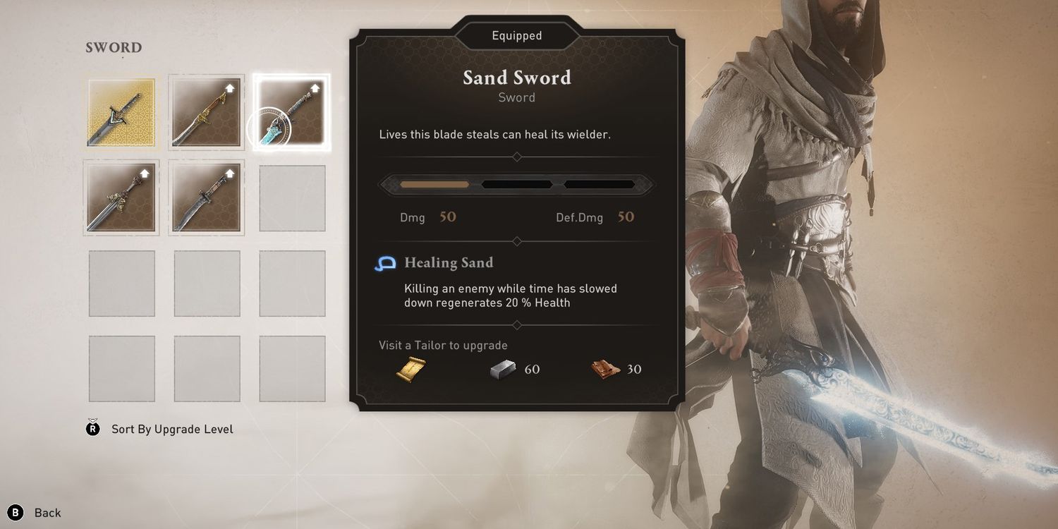 Al igual que la daga perteneciente al mismo rango, la espada del Caballero Abasí destaca sobre todo gracias a su ornamentación. El intrincado trabajo de diseño en la hoja deja claro que esta arma no fue un trabajo apresurado, y una empuñadura con algunas volutas une el aspecto general. Todas esas ranuras podrían hacer que esta espada sea un poco más difícil de mantener limpia, pero Espejismo del Credo del Asesino no atasca el juego con tales minucias, por lo que no hay ningún inconveniente real en su uso.