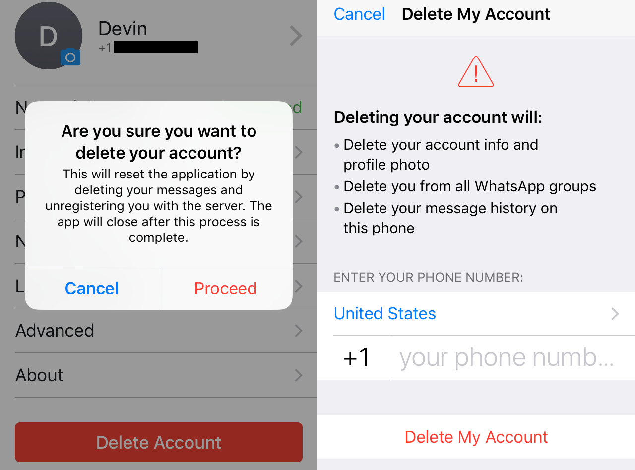 El siguiente mejor escenario es que tenga unos segundos o, como mucho, un minuto para eliminar o proteger su cuenta. La señal es muy buena al respecto: la opción de eliminación está en la parte frontal y central de la pantalla de opciones, y no tiene que ingresar ningún dato. WhatsApp y Telegram requiere que ingrese su número de teléfono, lo cual no es lo ideal; no lo haga correctamente y se conservarán sus datos.