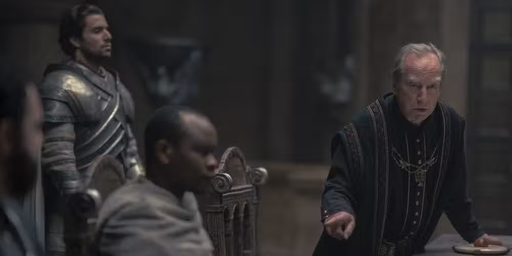 El caballero de la Casa Hardyng lucha contra un caballero vestido de amarillo oscuro y negro. Sin ver su sello, lo más probable es que sea un caballero de la Casa Beesbury de Honeyholt o de la Casa Jast. Lord Lyman Beesbury (Bill Paterson) es el Maestro de Monedas del Rey Viserys (Paddy Considine), quien expresa su indignación por el complot para usurpar a Rhaenyra (Emma D’Arcy) en Casa del Dragón.