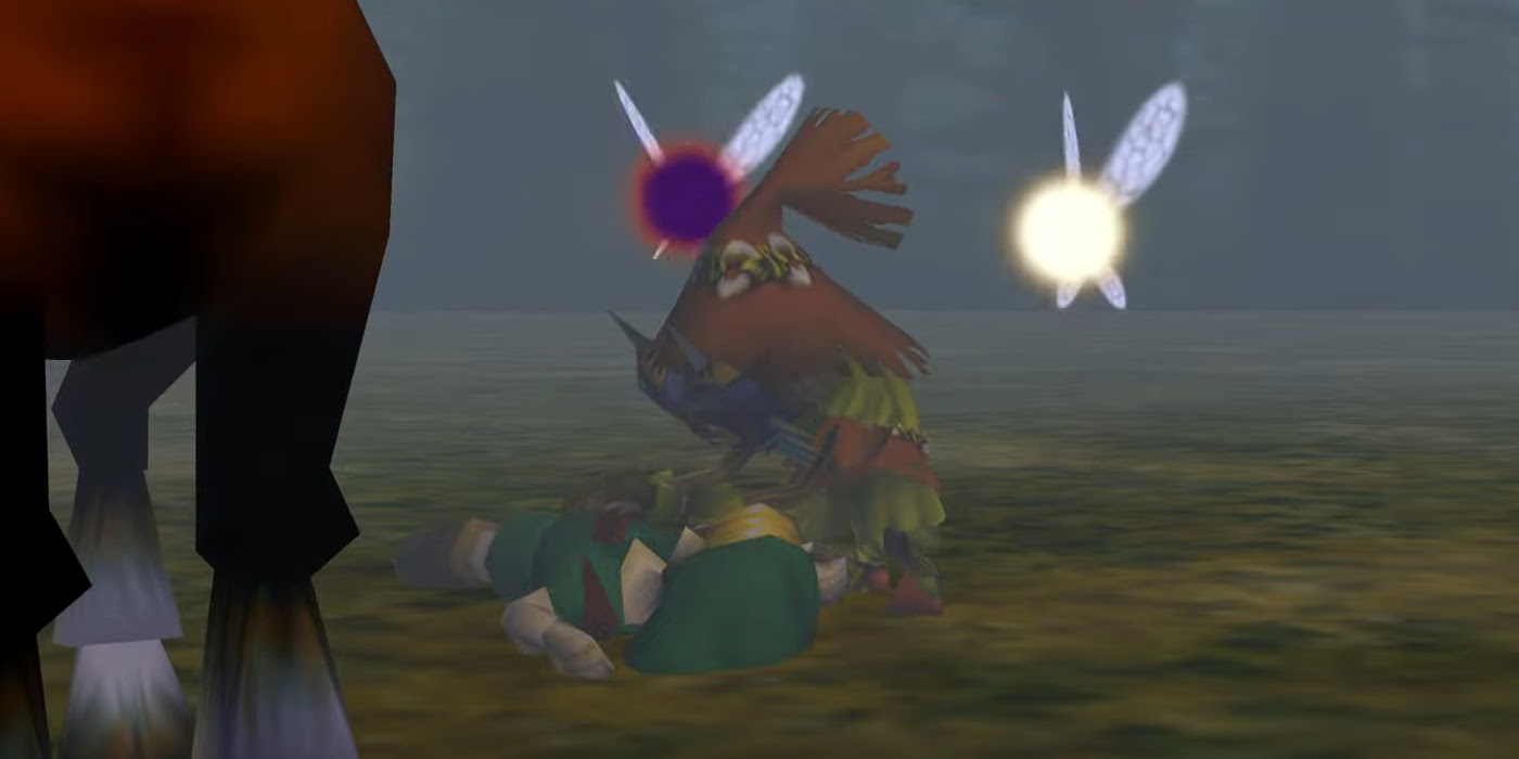de zelda Majora’s Máscaratambién en Nintendo 64, comienza con Young Link de Ocarina del tiempo buscando en el bosque a un Navi perdido cuando Tatl y Tael, las hadas de Skullkid, lo dejan inconsciente primero, y luego el mismo Skullkid. El jugador obtiene el control de Link por primera vez cuando se despierta y le roban su ocarina y Epona. Luego, Link persigue a Skullkid, quien lo atrae a un pozo que lo sumerge en el extraño mundo paralelo de Termina. Esta apertura es misteriosa e inquietante, ya que Link es arrastrado por su caballo por el espeluznante antagonista, inculcando el tono sombrío de máscara de Majora.