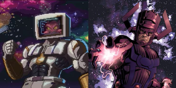Galacron se presenta bastante temprano como el malvado titán cósmico que destruyó el planeta natal de Marvelous Man, Caltron, aunque no se nombra hasta el episodio final de guardianes de la justicia. Su inmensa apariencia y su papel como destructor de planetas recuerdan inmediatamente al villano de Marvel, Galactus. Aunque divertido, el objeto parecido a un televisor donde debería estar su cabeza es obviamente una referencia a Krang de Tortugas Ninjas mutantes adolescentes.
