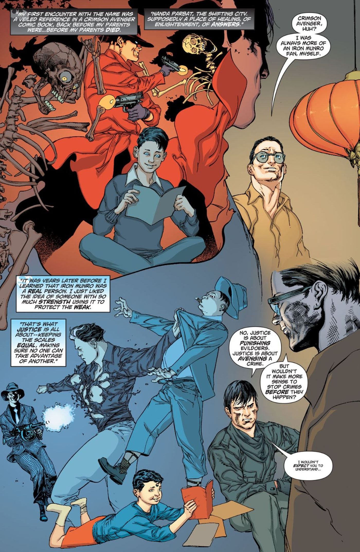 Sin embargo, falta una pieza en la historia de Batman y Superman que realmente arroja luz sobre cómo se convirtieron en los héroes que fueron. En superhombre #710 por J. Michael Straczynski, Chris Roberson, Eddy Barrows y Travel Foreman, Clark es convocado por Bruce, quien recientemente regresó de su presunta muerte en última crisis. Mientras los dos se ponen al día, reflexionan sobre la primera vez que se conocieron cuando ambos viajaban por el mundo, reuniéndose en Butrán para ayudar a defenderlo de Vandal Savage. Clark le pregunta a Bruce cómo se dio cuenta de la ciudad mística de Nanda Parbat, a lo que Bruce le revela que había oído hablar de la ciudad en historias que presentaban al héroe Crimson Avenger. Clark sonríe ante la referencia y menciona que siempre fue más fanático de Iron Munro.