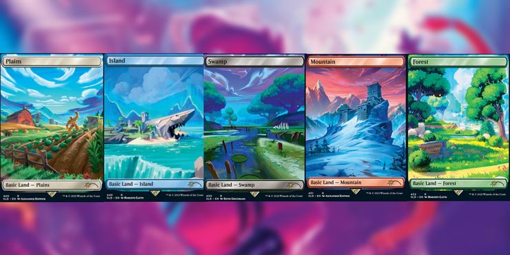 La primera revelación del mini-set es Fortnite: tierras y ubicaciones. Típico de sus tendencias recientes de reimprimir tierras básicas en nuevos estilos artísticos acordes con las franquicias cruzadas, este guarida secreta mini-set es un conjunto de tierras básicas del mundo de Fortnite, uno para cada color de maná. Las tierras en sí parecen tener un aspecto muy caricaturesco, acorde con el Fortnite Estilo de Arte.