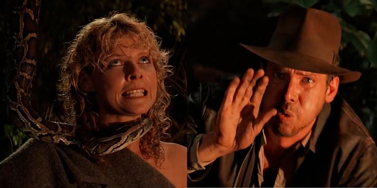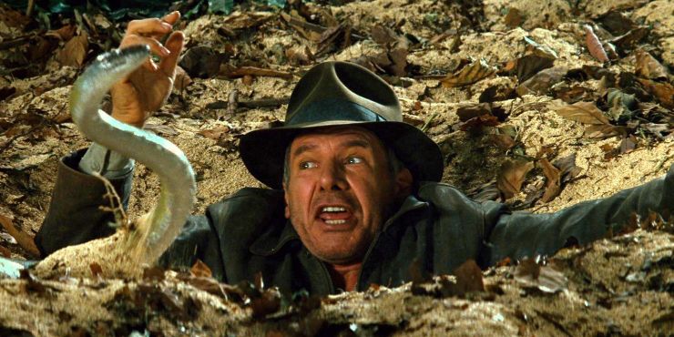 Indiana Jones y el Reino de la Calavera de CristalEl solitario encuentro con la serpiente es una de las partes más divertidas de la película. Después de escapar del campamento ruso, Indy y Marion quedan atrapados en un arenero seco en la jungla. Mutt agarra algo y lo usa para jalar a Marion de manera segura.