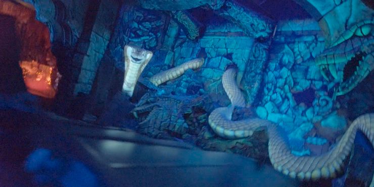 Pero el momento destacado de la Serpiente del Templo del Ojo Prohibido ocurre a la mitad del viaje cuando los visitantes se encuentran con una enorme serpiente animatrónica. En ese momento, se puede escuchar a Indy decir “¿Serpientes? ¡Ustedes están solos!” Es un momento fantástico en una experiencia ya impresionante que solo los increíbles Imagineers de Disney podrían dar vida.