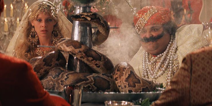 Una de las entradas más sorprendentes de la comida sería “sorpresa de serpiente”. Los sirvientes trajeron un plato con una serpiente gigante mientras los lugareños exclamaban con gran entusiasmo. Los sirvientes cortaron la serpiente para revelar cientos de serpientes bebés que los invitados sorben de manera repugnante. Si se filmó la reacción de Indy, no llegó al corte final, ya que se centró en interrogar a sus anfitriones sobre los rumores de Thugee.