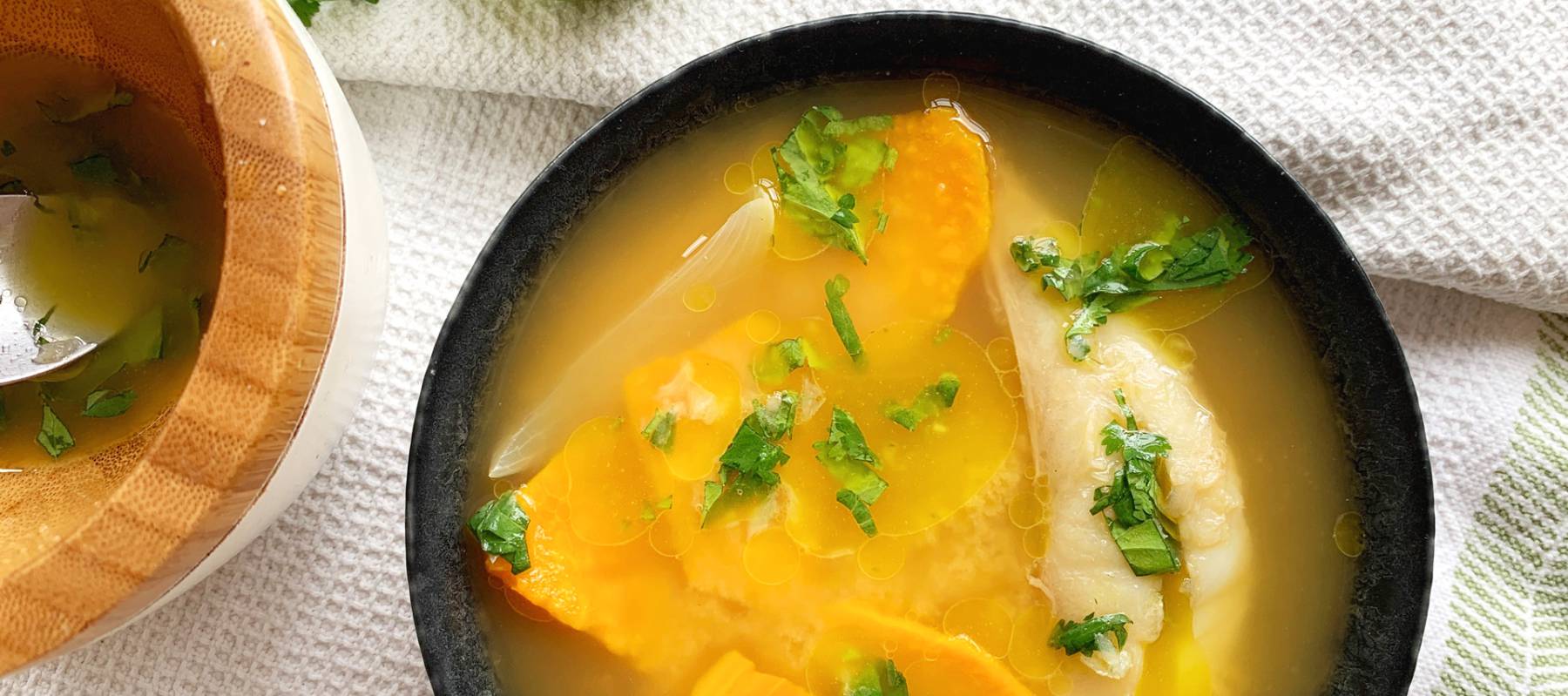 2 l de agua1 kg de espinas de rape, rodaballo o raya1 cebolleta1 cm de jengibre fresco2 zanahoriasAdemás