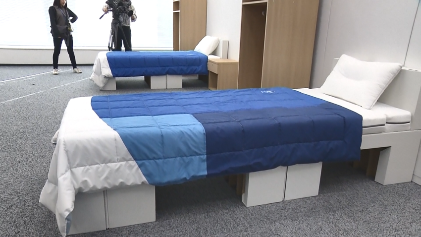 Las camas individuales, mostradas el jueves en la sede del comité organizador, se reciclarán después de los juegos para fabricar productos de papelería.