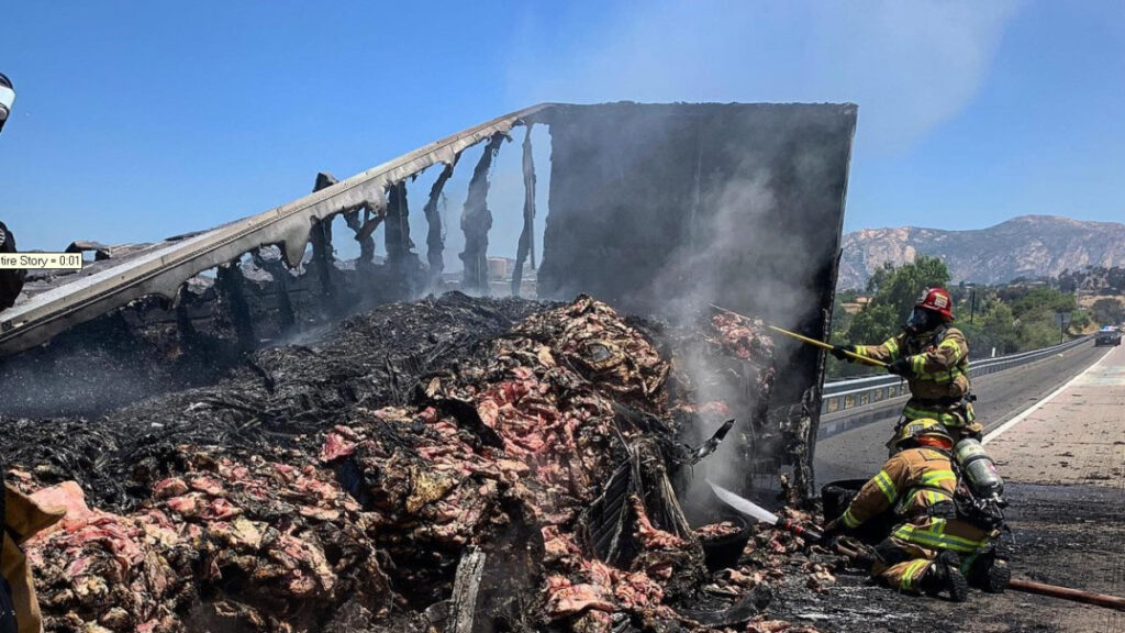 Cuando llegaron al lugar, los bomberos encontraron el camión que transportaba 40,000 libras de carne de cerdo envuelta en llamas.