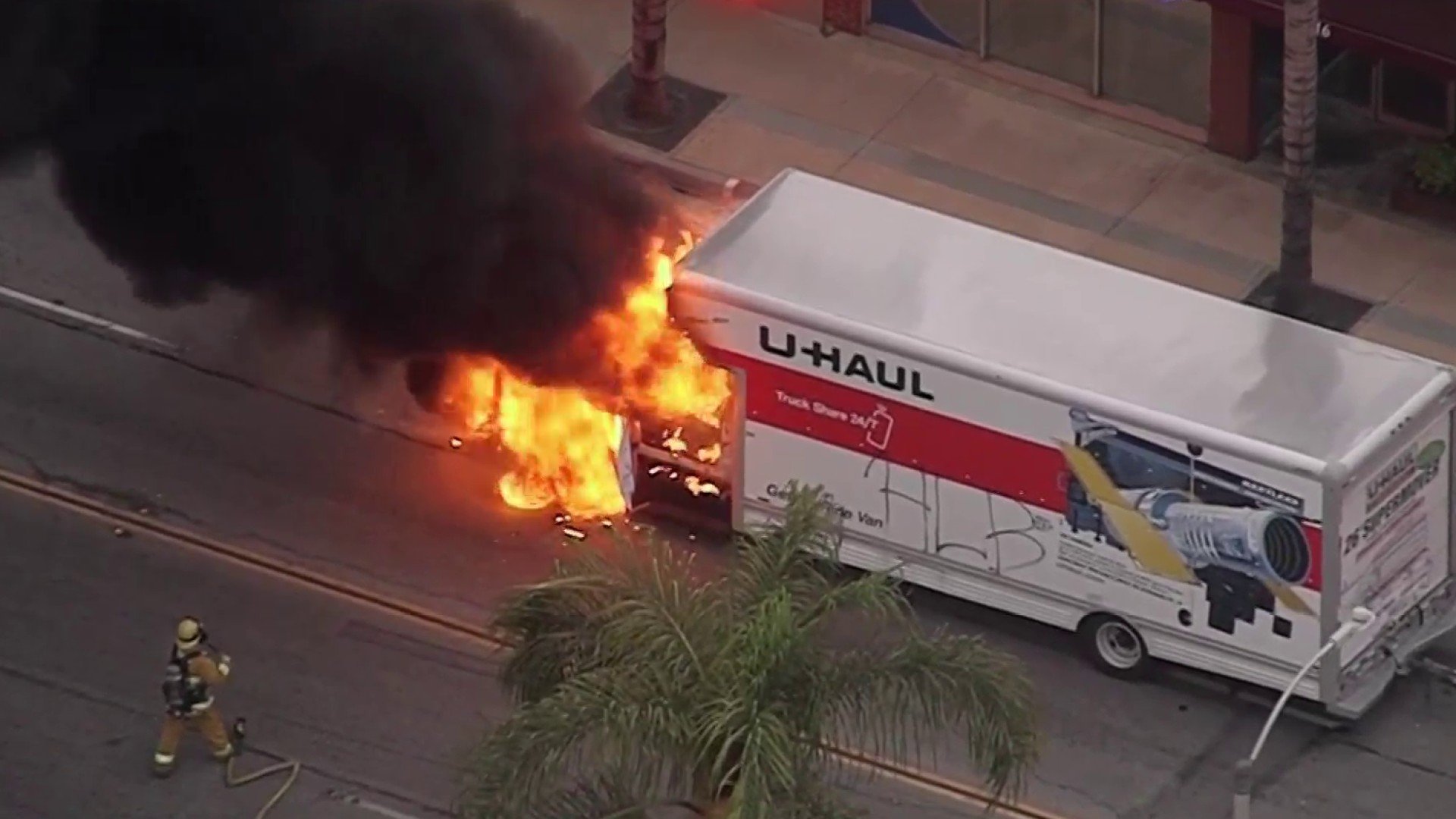 Los bomberos trabajaron rápidamente para extinguir el fuego mientras consumía el camión U-Haul.