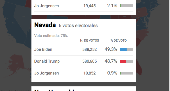 Hasta ahora, con 75% del voto estimado, en Nevada va adelante Joe Biden, con 49.3% de la votación, frente a 48.7% de Trump. Los 6 votos electorales que representa este estado le darían a Biden los 270 que necesita para llegar a la Casa Blanca, ya que actualmente tiene 264.