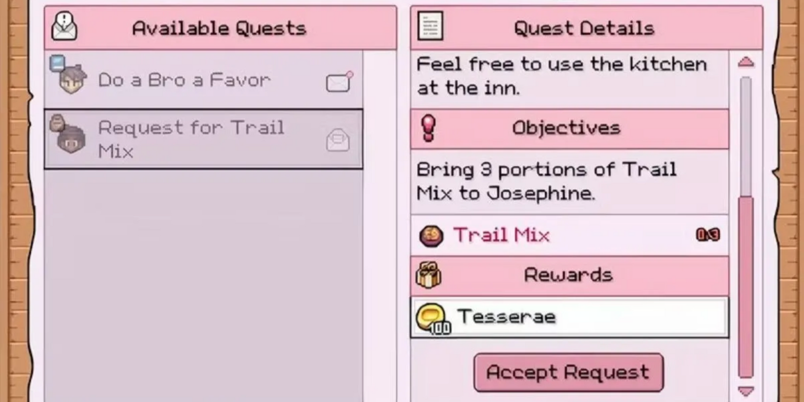 Al igual que otros simuladores agrícolas, Fields of Mistria cuenta con un tablero de peticiones que permite a los habitantes de la ciudad pedirles que les traigan cosas a cambio de una pequeña recompensa. A menudo, se trata de objetos sencillos que se pueden conseguir fácilmente, pero en el caso de la petición de Josephine, Necesitarás preparar una mezcla de frutos secos con un par de ingredientes diferentes. En primer lugar, acomódate en el juego y revisa el tablero de solicitudes diariamente hasta que llegue la solicitud de Josephine.