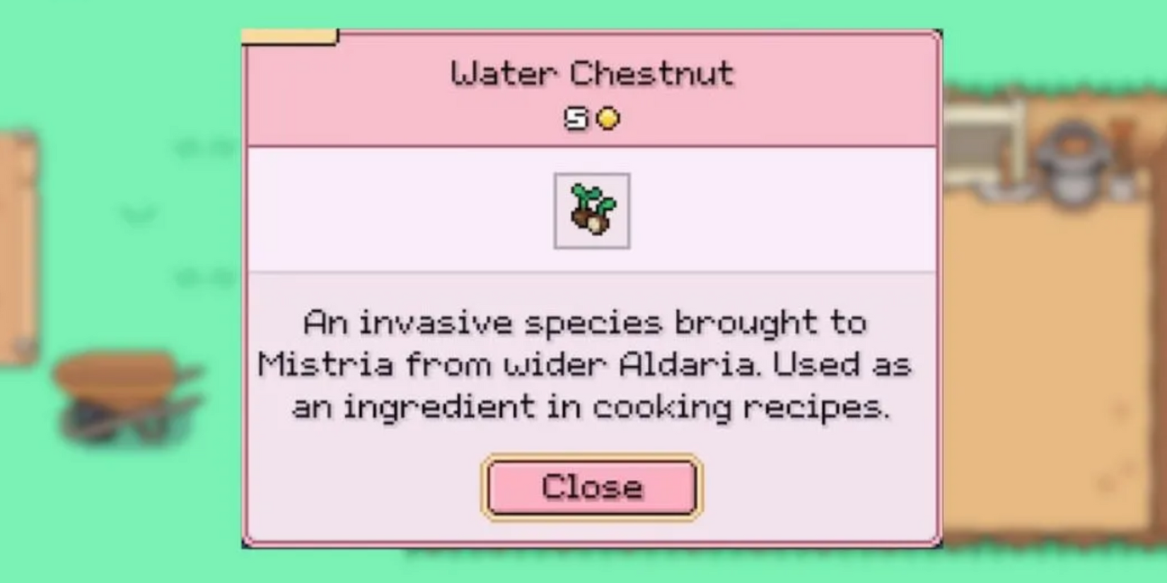 Después de un par de días de juego, verás el tablero de solicitudes en Campos de Mistria. Después de recoger la petición de Josephine, tendrás un poco de tiempo para buscar los ingredientes que necesitarás, así que dirígete al oeste de la ciudad hacia Narrows. Aquí, Esté atento a los pequeños mechones verdes que sobresalen del río; estas son las castañas de agua que necesitaráasí que toma algunos de ellos. Afortunadamente, esta solicitud es mucho más sencilla que la misión de la esposa del pirata en Valle Stardew.