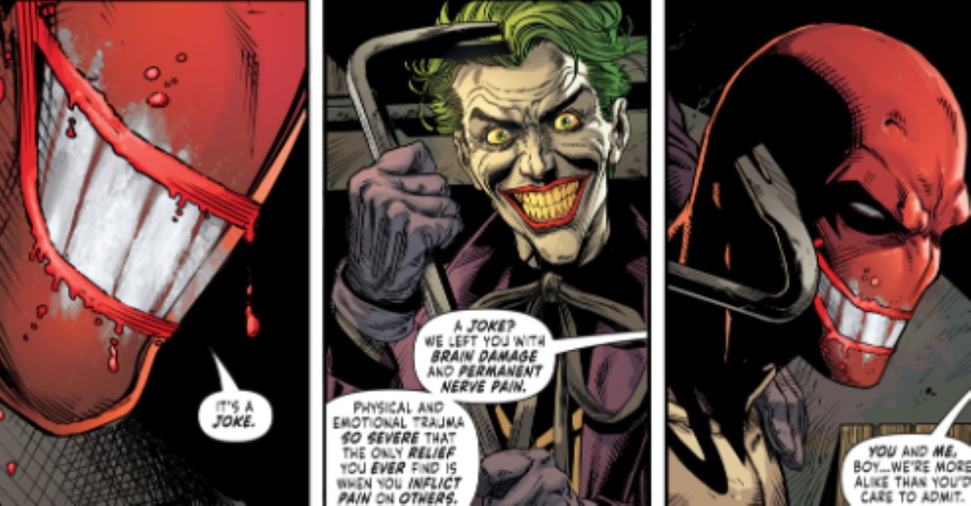 “/> Esta oscura respuesta se produce durante una intensa escena en Tres comodines # 2, donde los dos Jokers restantes lograron una vez más secuestrar y torturar al ex Robin, una espantosa devolución a la muerte de Jason en hombre murciélago #427 – por Jim Starlin, Jim Aparo, Mike DeCarlo y Adrienne Roy. Lo que hace que la respuesta de Jason sea particularmente inquietante es lo inquietantemente similar que suena a algo que diría el propio Joker. Esto se confirma en Batman: Tres comodines #2 cuando, en respuesta a la respuesta de Jason, Joker comienza a hablar de lo parecidos que son, trazando un paralelo inquietante, diciendo que ambos solo pueden encontrar alivio a su propio dolor infligiéndolo a otros.