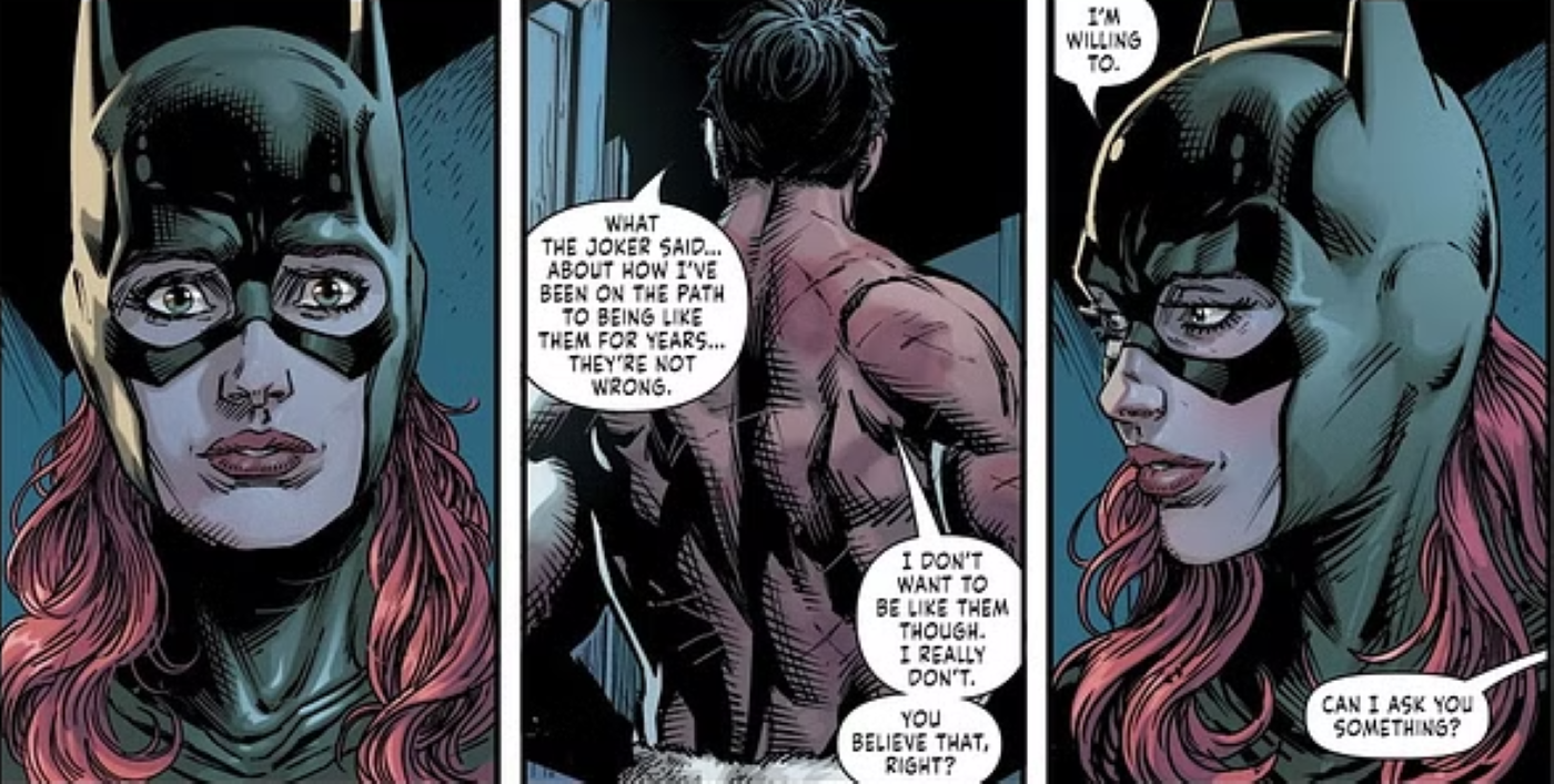 “/> En el mismo número, el loco continúa diciendo: “Tú y yo, muchacho… somos más parecidos de lo que te gustaría admitir..” Luego intenta recordar sus similitudes, comentando que el mismo odio los alimenta y que no odian a nadie más en el mundo que a Batman. Joker no es el único que ve las similitudes entre él y el ex Robin. Más tarde en Batman: Tres comodines #2, el propio Jason admite en la confianza de Batgirl que él también ve las similitudes entre él y el Joker, pero también expresa desesperadamente su deseo de ser diferente.