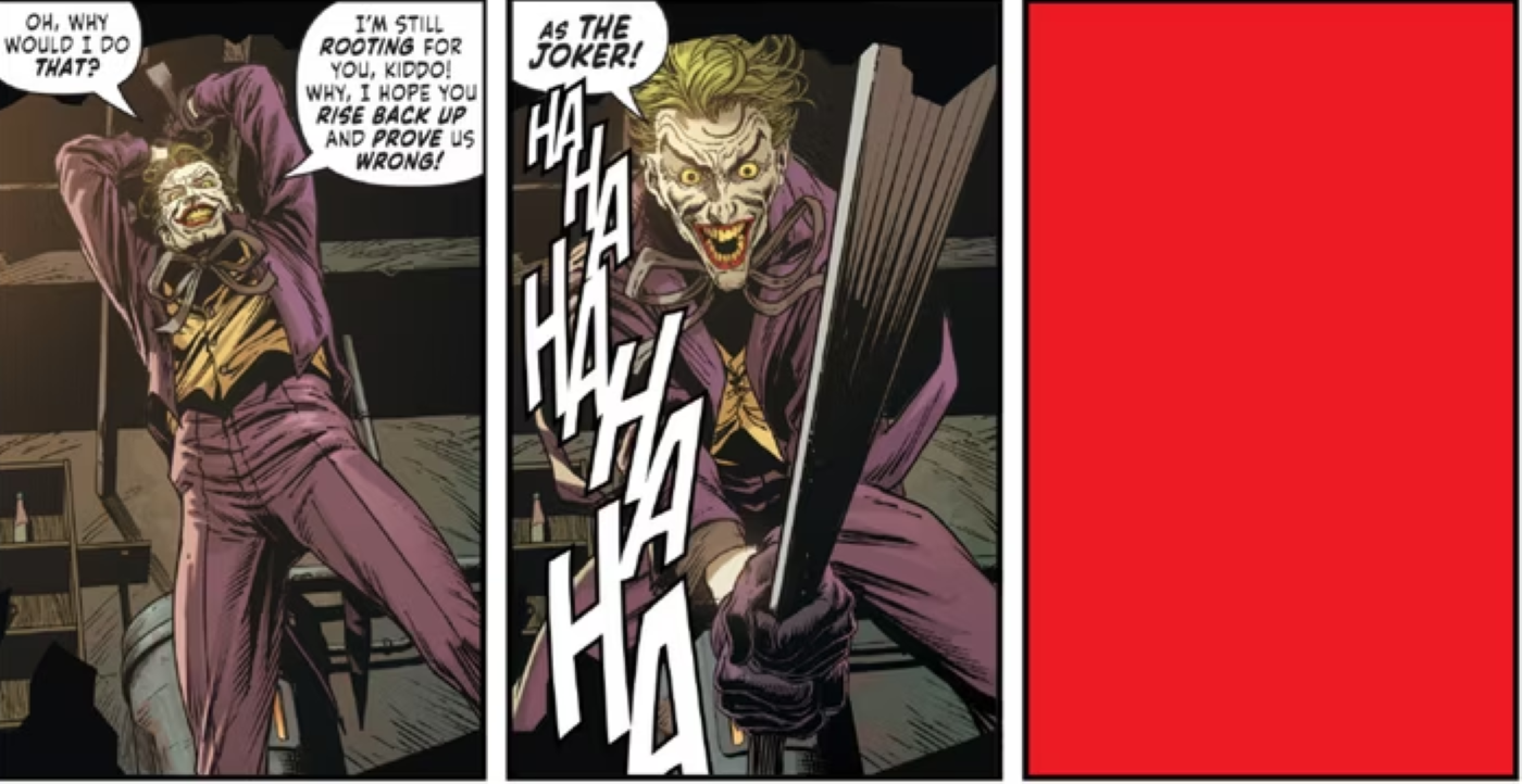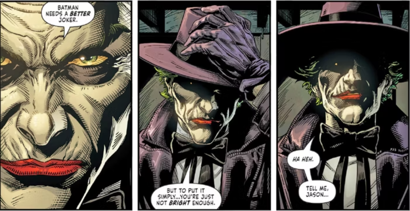 “/> En Batman: Tres comodines #2 de Geoff Johns, Jason Fabok, Brad Anderson y Rob Leigh, Jason Todd es secuestrado y brutalizado por los Jokers, una escena inquietantemente similar al encuentro fatal de Jason con el Joker en Muerte en la familia. Durante su tortura, los Jokers confiesan que pensaron que Jason sería el candidato ideal en su plan para crear otro Joker. Sin embargo, deciden no sumergir a Red Hood en su piscina llena de químicos ACE, afirmando que “simplemente no es lo suficientemente brillante“Ser uno de ellos. A los ojos de los Jokers, esto fue un fracaso por parte de Jason por no cumplir con sus estándares, lo que resulta en Jason “defecto” al convertirse en el Joker.