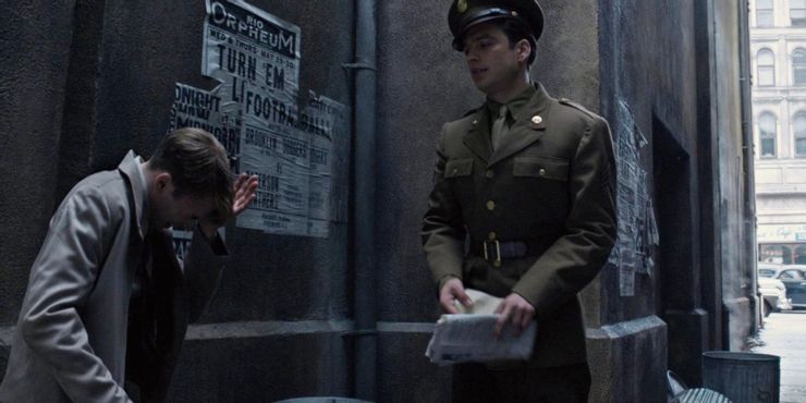 El hombre que disolvió a los Vengadores tuvo un debut relativamente decepcionante. Al venir al rescate de Steve en el callejón trasero de un cine, Bucky aparece por primera vez con su uniforme del ejército después de haber sido reclutado en el 107 (la antigua infantería del padre de Steve).