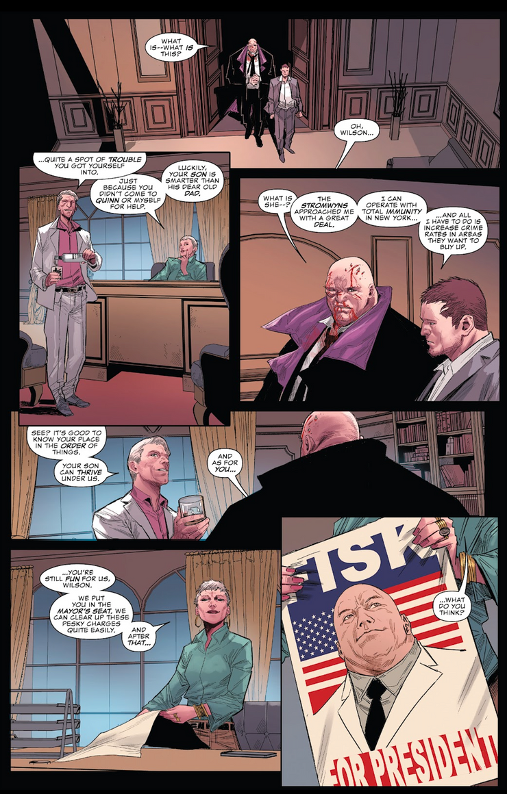 “Por supuesto que trabajarías para nosotros”, dice uno de los posibles manipuladores de Fisk. “Te guiaríamos en cuestiones políticas aburridas… pero este es el trato: serás presidente, trabajarás para Una y para mí, y serás un hombre libre”. El manejador de Fisk extiende una mano y Kingpin la sacude… antes de apretar y presumiblemente romper la mayoría de los huesos de dicha mano. “Un Fisk no se inclina ante nadie” la narración de Kingpin informa al lector mientras lucha para salir de la habitación. Le dice a su hijo que informe a la ciudad que lo mató, convirtiéndolo así en el nuevo Kingpin, antes de irse de Nueva York con su esposa.
