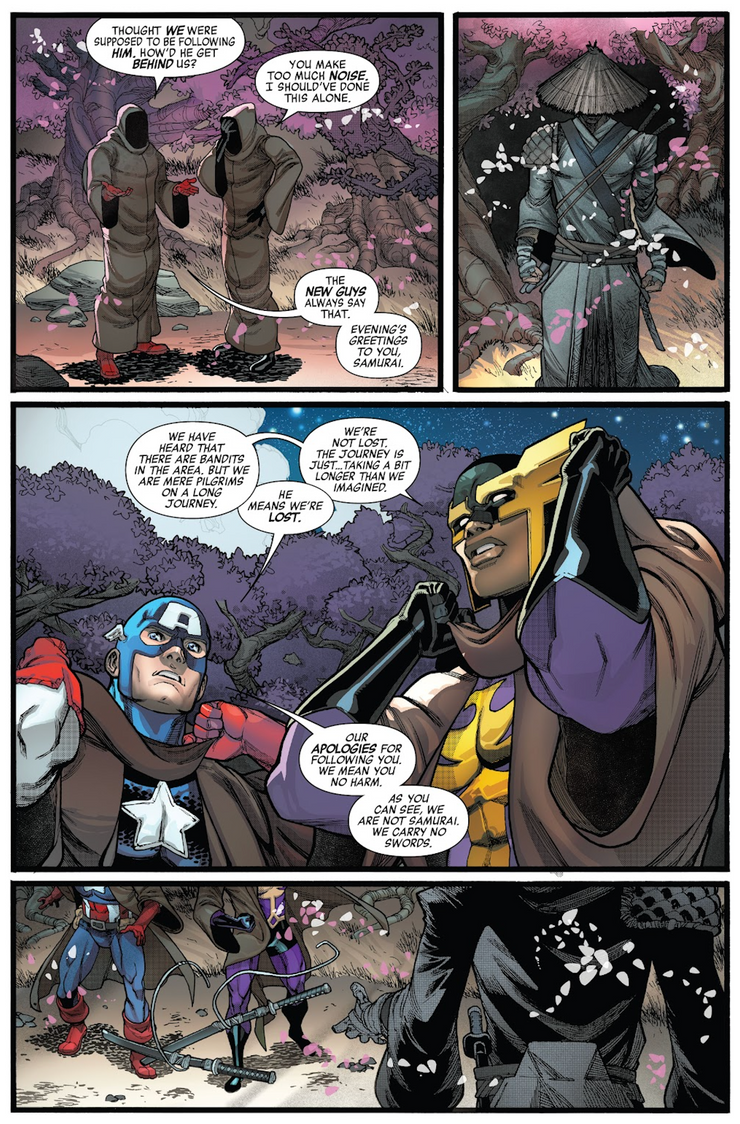 En Vengadores #58, escrito por Jason Aaron con arte de Javier Garron, el Capitán América y Nighthawk se encuentran en el Japón feudal (específicamente en el período Edo) y se disfrazan de peregrinos sin pretensiones. Los dos están tras la pista del Ghost Rider de este universo en particular, el Ghost Ronin de Japón. Fiel a su nombre, Ghost Ronin se acerca a los dos Vengadores sin ser detectado por ninguno de los miembros, lo que incita a Nighthawk a decir “Haces demasiado ruido. Debería haber hecho esto solo”. “Los chicos de las noticias siempre dicen eso”, responde el Capitán América.