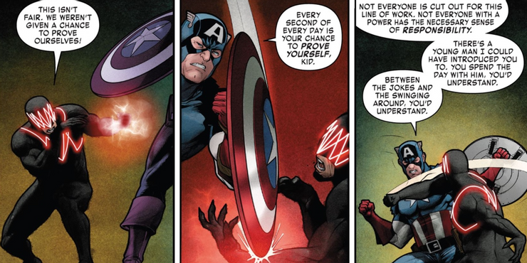 Una vez que el Capitán América y Iron Man descubren lo que han hecho los Paladines, intentan arrestarlos por sus crímenes irreflexivos, lo que desencadena una batalla bastante unilateral. Mientras el Capitán América acaba con el líder de los Paladines, Vox, admite que su enemigo tenía potencial para convertirse en un superhéroe real y podría haber aprendido de alguien que realmente comprendiera la responsabilidad de poseer un gran poder. Cuando Rogers dice esto, no está hablando de sí mismo, sino de otro miembro de los Vengadores. El Capitán América dice: “Hay un joven que podría haberte presentado. Si pasas el día con él, lo entenderías. Entre las bromas y el balanceo, lo entenderías.Sobre la base de lo que le dice a Vox y la consideración que tiene por el Vengador en cuestión, los comentarios del Capitán América sugieren que ve a Spider-Man como el símbolo ideal de los valores de los superhéroes.